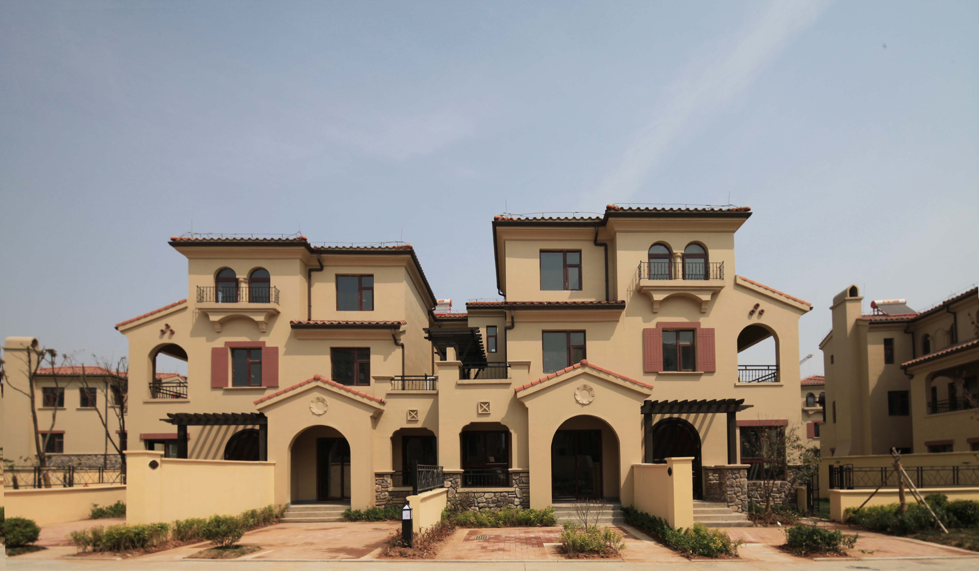 在外立面的設(shè)計(jì)上,建筑著重突出整體的層次感和豐富的空間表現(xiàn)。拱圈、陶瓦、氣孔等配合了文化石與手抹灰墻面,以豐富的細(xì)節(jié)呈現(xiàn)出優(yōu)美的造型和獨(dú)特的風(fēng)格。立面設(shè)計(jì)清爽、明快,有層次的疊落露臺(tái),觀景平臺(tái),使建筑內(nèi)外的景觀相互融合,為業(yè)主營(yíng)造一種自由、休閑的小鎮(zhèn)生活。規(guī)劃整體布局借鑒歐洲小鎮(zhèn)住宅的型式,圍合的組團(tuán)空間成為小鎮(zhèn)空間的基本單元,庭院理念設(shè)計(jì)營(yíng)造出既保持傳統(tǒng)文化又獨(dú)具西方舒適性的生活氛圍,并通過(guò)建筑體量圍合出相對(duì)私密的尺度及宜人的組團(tuán)院落。